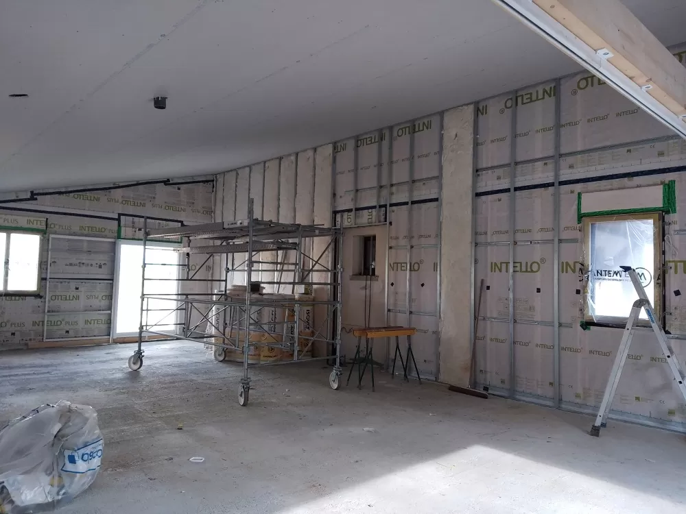 Votre architecte à Val Buech Méouge, dans son intervention sur une extension en ossature bois, a fait installer une contre cloison intérieure permettant à la fois la réservation technique pour le passage des réseaux comme l'électricité et la plomberie et un complément d'isolation sans percer le pare vapeur. La structure porteuse en MOB avec un isolant intégré biosourcé en laine de bois est terminée par un pare vapeur hygro-variable en face intérieure. L'ajout du complément d'isolation en laine de verre nue permet en plus une amélioration acoustique.